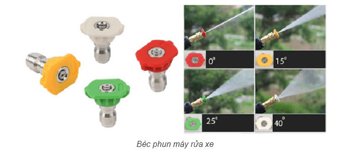 Béc phun: Đây là chi tiết giúp tia nước thoát ra khỏi súng phun có đặc điểm và độ mạnh/nhẹ khác nhau như phun thẳng, phun xòe, phun sương,... Trong cấu tạo máy xịt rửa cao áp thường có 4 béc phun là 0 độ, 15 độ, 25 độ và 40 độ.