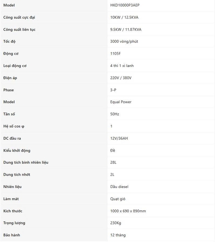 2. Thông Số Kỹ Thuật Máy Phát Điện Hakuda HKD10000P3AEP 3 Pha