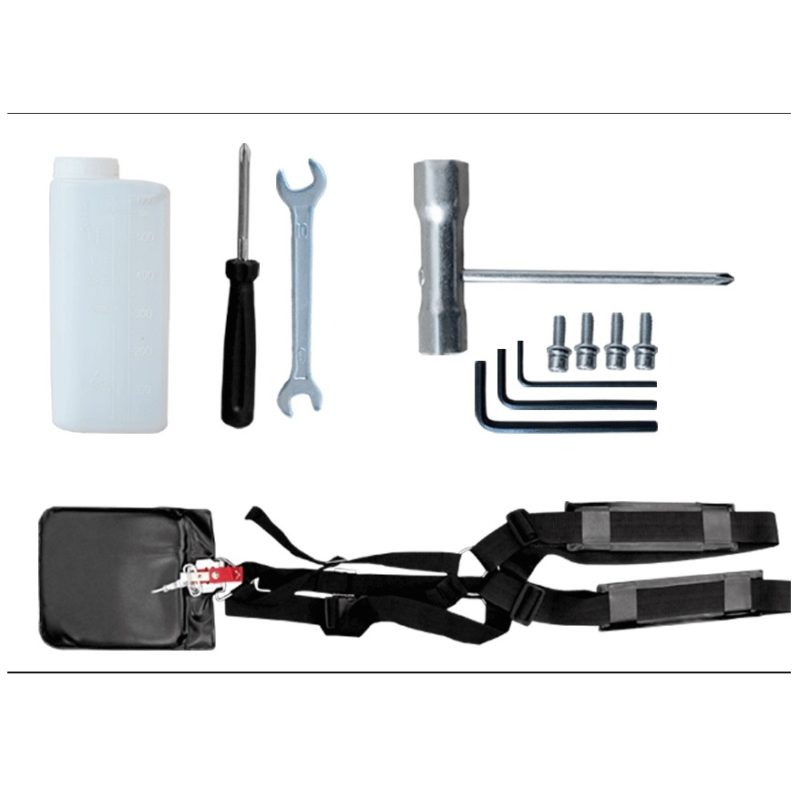 Bộ phụ tùng dụng cụ bao gồm : 1 bình pha, 1 dây đeo và pas gắn dây đeo 1 cái, 1 lưỡi cắt cỏ (305mm x 90mm x 25,4mm x 1,6mm), 1 chắn cỏ, 1 tay cầm trái và 1 bịch phụ tùng (bulon, lục giác, lục giác 4 – 5, khóa mở bugi).