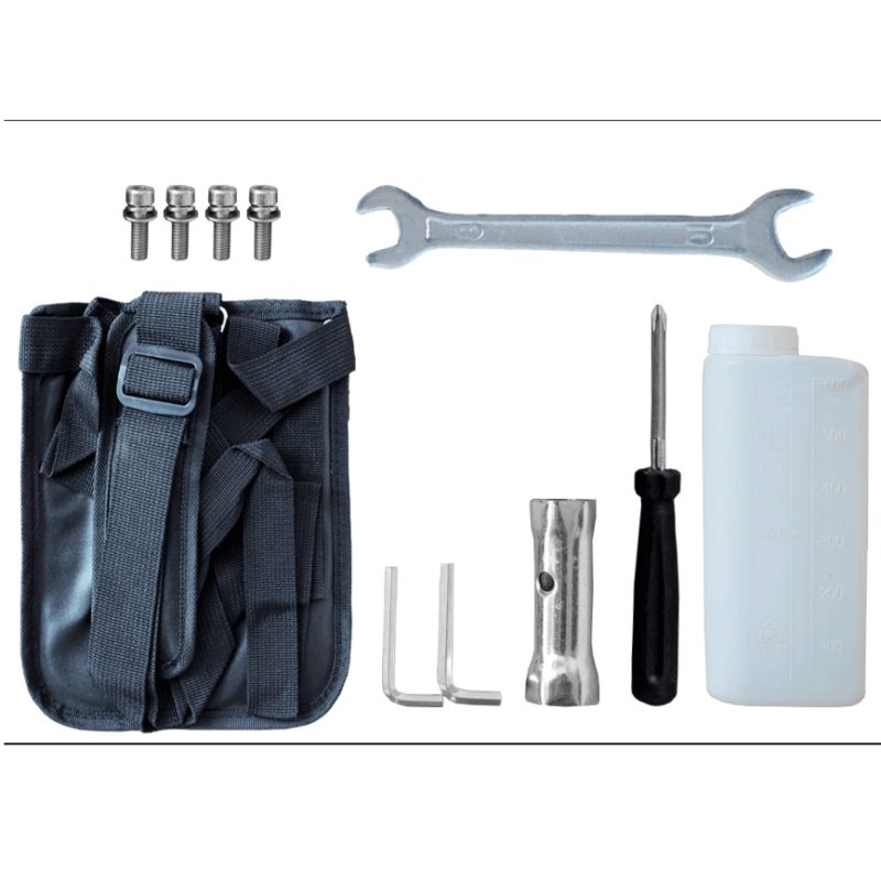 Bộ phụ tùng dụng cụ bao gồm : 1 bình pha, 1 dây đeo và pas gắn dây đeo 1 cái, 1 lưỡi cắt cỏ (305mm x 90mm x 25,4mm x 1,6mm), 1 chắn cỏ, 1 tay cầm trái và 1 bịch phụ tùng (bulon, lục giác, lục giác 4 – 5, khóa mở bugi).