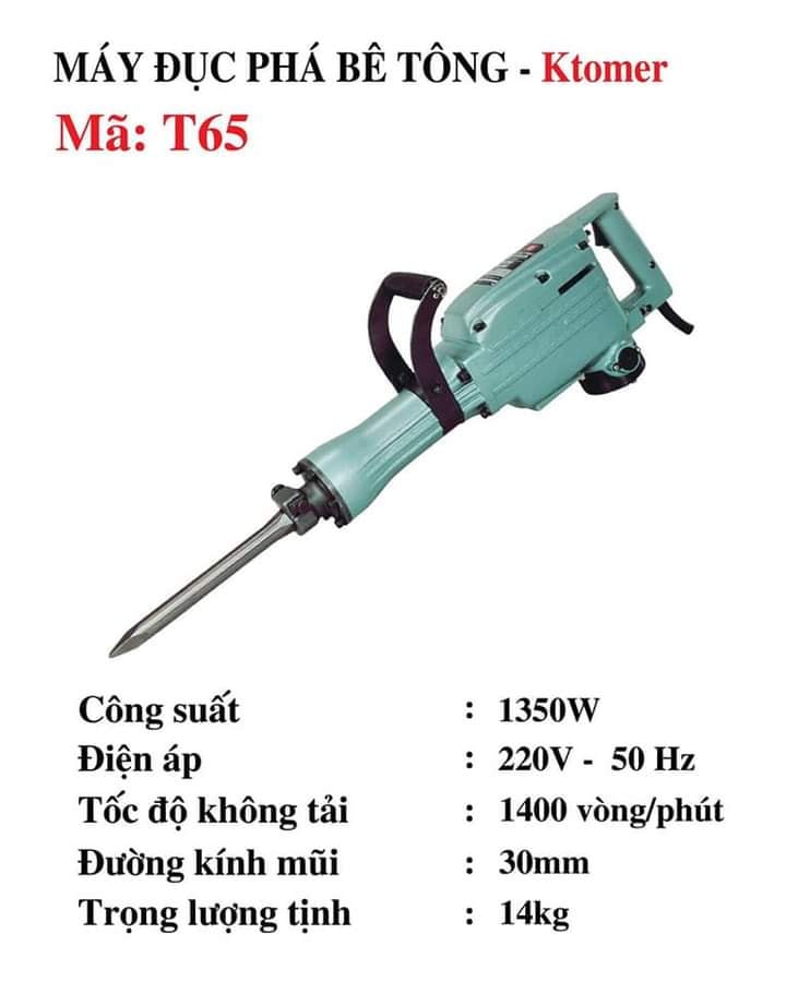 – Máy Đục Bê Tông Ktomer T65 2200W là dòng máy đục bê tông mới nhất của hãng Ktomer. Máy đục bê tông được làm từ kim loại với thiết kế rất chắc chắn. Máy trang bị tay cầm phụ trợ lực xoay 360 độ.