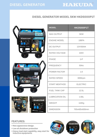 Trong bài viết này, chúng tôi xin giới thiệu đến quý khách hàng máy phát điện chạy dầu Hakuda 5KW HKD5000P1T, một trong những sản phẩm đang được ưa chuộng trên thị trường hiện nay. Máy được sản xuất tại theo công nghệ Nhật Bản, nhà máy đặt tại Trung Quốc, sở hữu thiết kế hiện đại, kiểu dáng chắc chắn cùng hệ thống vận hành ổn định. Bên cạnh chất lượng đảm bảo, sản phẩm còn có mức giá hợp lý, phù hợp với nhiều nhu cầu sử dụng khác nhau.