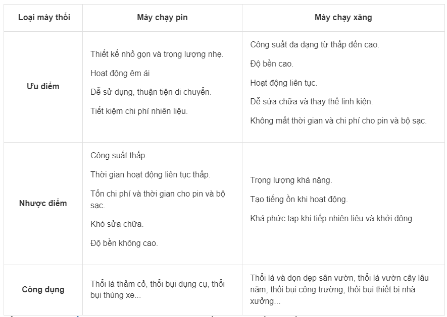- Thời gian sử dụng hạn chế: Máy thổi lá chạy pin bị giới hạn bởi dung lượng pin, nên sẽ cần sạc lại sau một thời gian sử dụng. Pin dự phòng có thể giúp tăng thời gian hoạt động nhưng sẽ làm tăng chi phí.
