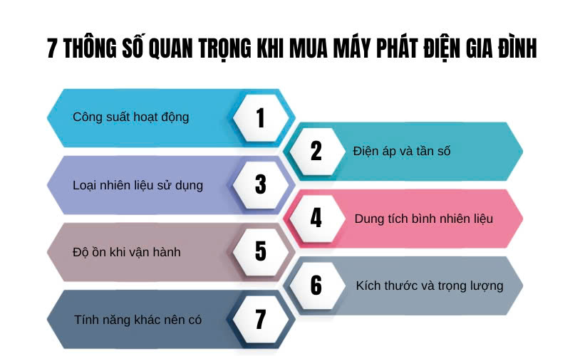 Dưới đây là 7 thông số kỹ thuật khi mua máy phát điện gia đình mà bạn cần đặc biệt lưu ý để đảm bảo bạn có thể chọn lựa đúng sản phẩm, tránh lãng phí và tối ưu hóa hiệu quả sử dụng.